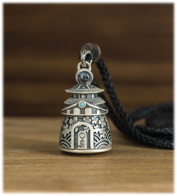 The pagoda symbolizes peace and shelter, while the vintage silver carries the mark of time.